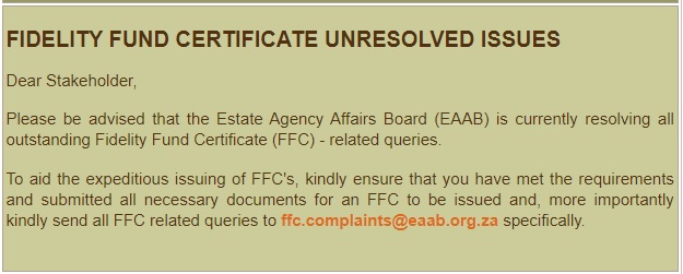 The EAAB has acknowledged the backlog on their website homepage www.eaab.org.za but according to agents, emails addressed to ffc.complaints@eaab.org.za have largely been ignored.
