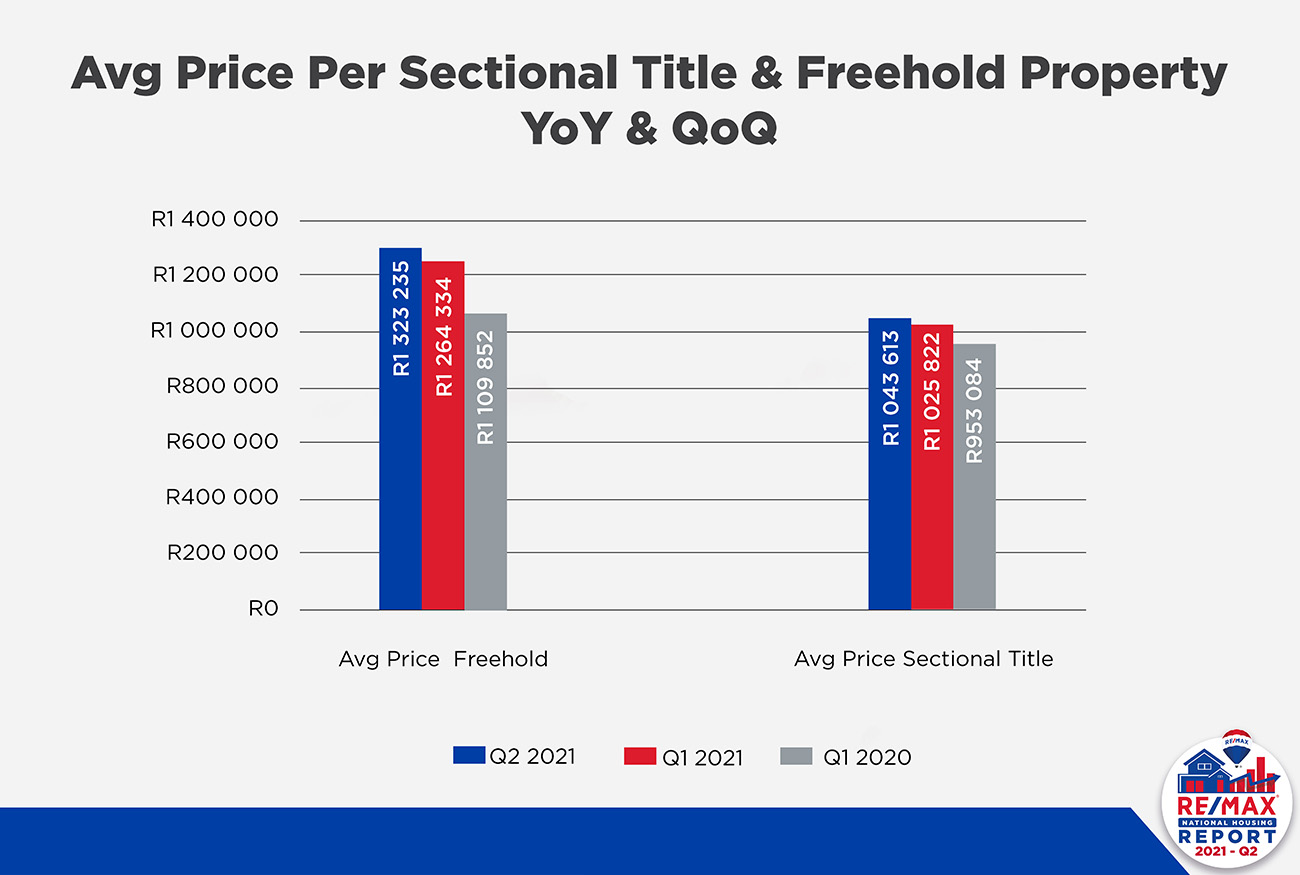 According to Lightstone Property data, the nationwide average price of sectional titles for Q2 2021 is R1,043,613 and the nationwide average price of freehold homes is R1,323,235.