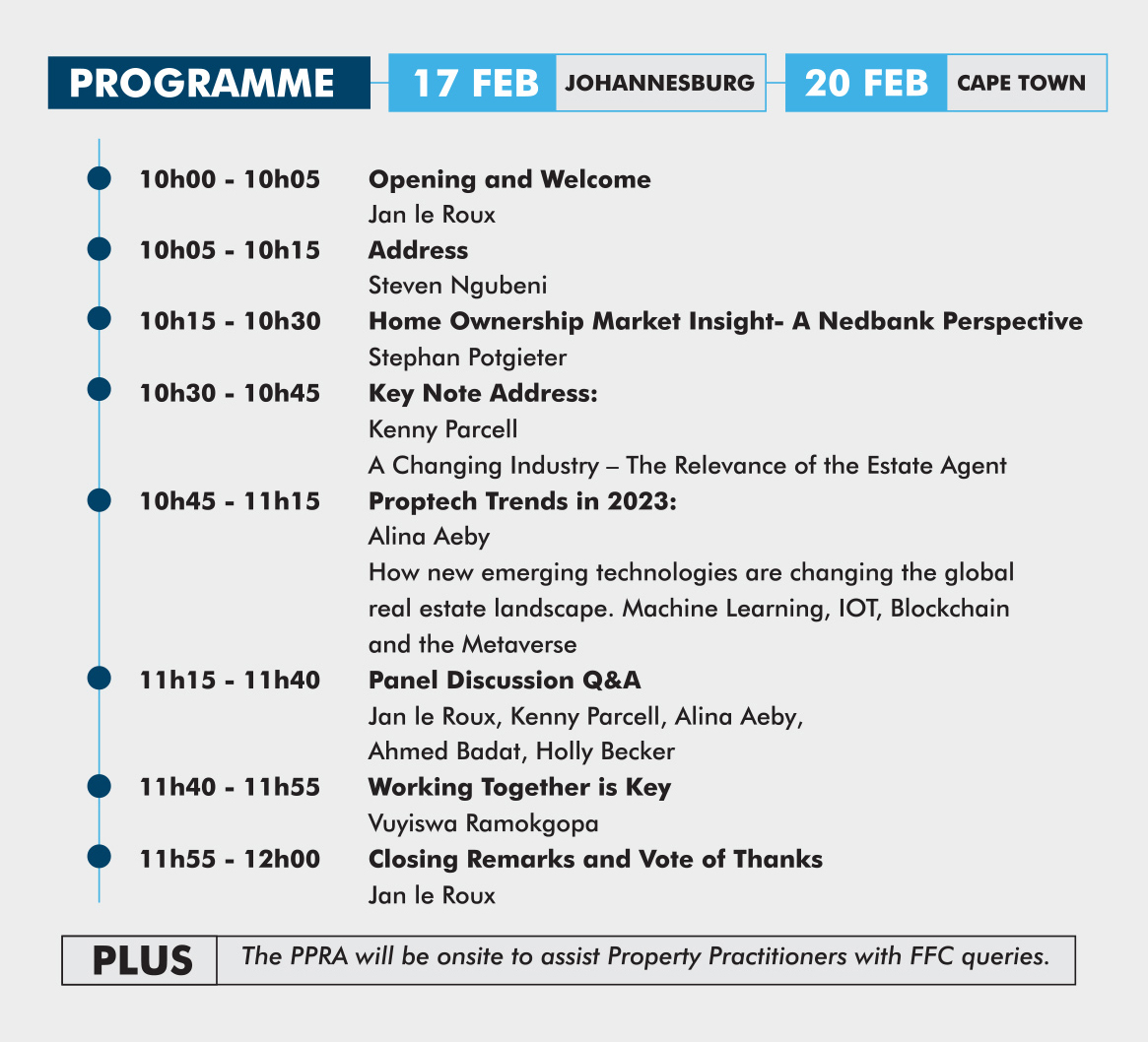Join Mr Steven Ngubeni – Chairperson of the PPRA, Mr Kenny Parcell – President of the NAR, Vuyiswa Ramokgopa – Chairperson of the NPPC, and other key industry leaders for a morning dedicated to the future of real estate through a series of sessions and panel discussions. Notably, the keynote address by Parcell titled “A changing industry, the relevance of the estate agent”, and the session hosted by Alina Aeby, NAR Global Coordinator for Eastern Europe/Middle East/Africa on proptech trends.